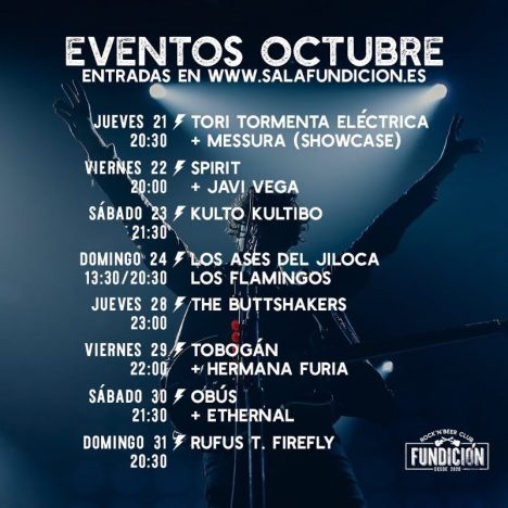 La inauguración de hoy arrancará a las 20.30 horas (entrada libre hasta completar) y los asistentes podrán disfrutar de las actuaciones de Tori Tormenta Eléctrica (DJ) y Messura. La celebración continuará el fin de semana con la actuación gratuita del trío riojano-navarro Spirit (versiones de rock) y el DJ Javi Vega el viernes, la actuación de la banda de rap-reggae de Irún Kulto Kultibo el sábado, y la doble propuesta del domingo, con Los Ases del Jiloca en sesión vermú y el grupo tudelano de pop-rock Los Flamingos. La programación de octubre (ver cartel inferior) se cierra con nombres como Rufus T. Firefly, Tobogán y The Buttshakers, entre otros, y en noviembre actuarán Ciclonautas, Vargas Blues Band y Porretas, entre otros. Toda la info está disponible en la web de la Sala Fundición.