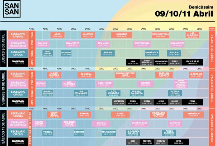El SanSan Festival de Benicàssim (Castelló) celebra una nueva edición entre el 9 y el 11 de abril. Lo hace con un cartel cargado de propuestas internacionales como Bombay Bicycle Club, 2manydjs y Chef'special, así como nombres importantes del panorama estatal a la altura de Sidecars, Delaporte, Dorian, La Casa Azul, Miss Caffeina, Zahara, Carolina Durante, Locoplaya y Leiva, entre otros. A un mes del evento, el festival publica el horario completo para que los asistentes puedan organizarse de cara a unos días repletos de propuestas interesantes.