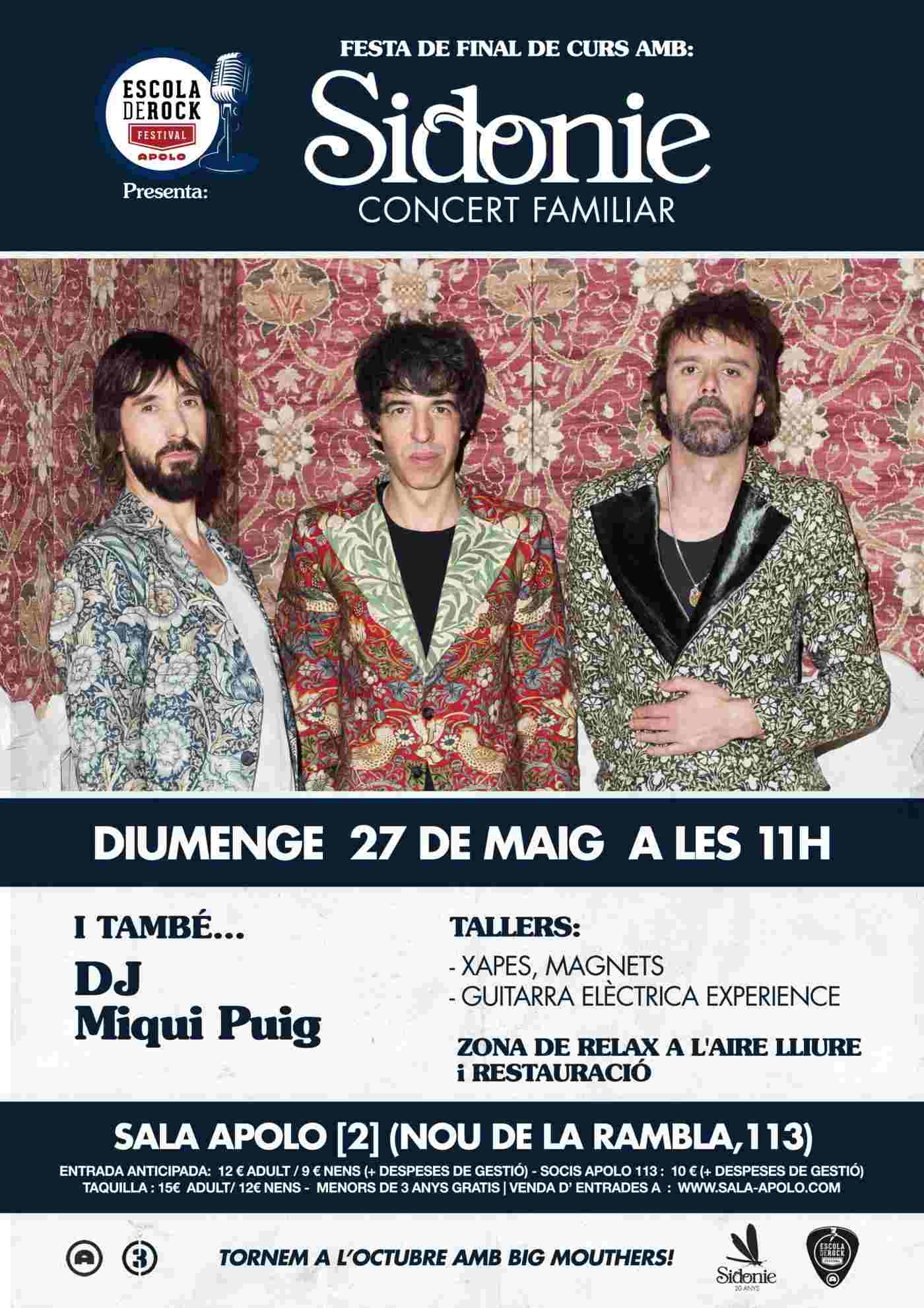 Después de agotar los entradas de todos los conciertos de celebración de su 20 aniversario, el trío barcelonés continúa la fiesta con este concierto especial pensado para niños y para los padres que no pueden ir a verlos en concierto fácilmente. El concierto de Sidonie tendrá lugar a las 11h de la mañana y formará parte del ciclo Escola de Rock Festival, que cada mes organiza matinales familiares temáticas en la Sala Apolo combinando música en directo y actividades paralelas diseñadas expresamente para niños.