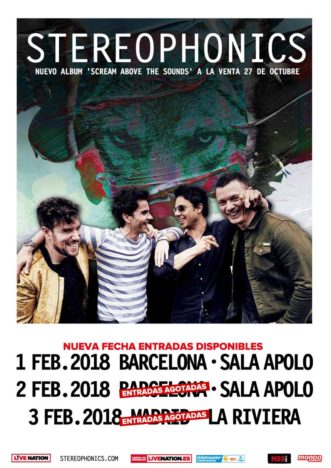 Tras agotar las entradas de sus conciertos en Barcelona y Madrid, Live Nation acaba de confirmar una segunda fecha de Stereophonics el día 1 de febrero en la Sala Apolo de Barcelona. La banda presentará su nuevo disco “Scream Above The Sounds” (Warner, 17), que se estrenó el pasado 27 de octubre: “Siempre intentamos evolucionar, encontrar cosas nuevas que implementar y descubrir qué es lo que a la gente le gusta más de nosotros”, dice Richard (bajista) a propósito de su último lanzamiento. Pero cómo no, y teniendo en cuenta que la trayectoria de esta banda suma ya veinte años, en sus conciertos no podrán faltar los himnos clásicos como “Dakota’”, “Have A Nice Day” o “Maybe Tomorrow”.
