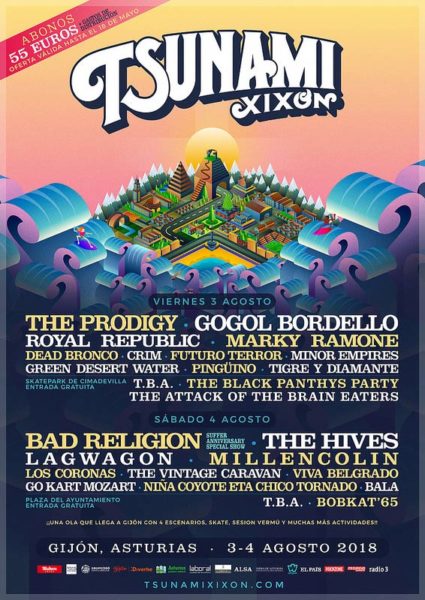 En lo que respecta al reparto del cartel por días, The Prodigy y Gogol Bordello encabezan el viernes mientras que el sábado se centra más en la cara punk rock del festival con Bad Religion, Millencollin y Lagwagon. The Black Panthys Party, The Attack Of The Brain Eaters y otro grupo por confirmar tocarán gratis el primer día en el skatepark de Cimavilla, mientras que Bobkat'65 son uno de los dos grupos que actúan gratis el sábado, en este caso en la plaza del Ayuntamiento. Aquí puedes ver el cartel completo: