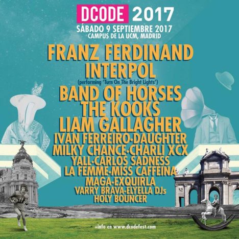 El próximo 9 de septiembre se celebra en el Campus de la UCM de Madrid el festival que marca el fin del verano: DCODE 2017. El pasado mes de marzo, la organización desveló casi al completo el cartel de este año, destacando las actuaciones de Interpol, que interpretarán al completo su primer disco “Turn On The Bright Lights” (Matador Records, 2002), Band Of Horses, Liam Gallagher, Charli XCX, The Kooks, Daughter, Milky Chance o La Femme; además de los artistas nacionales: Iván Ferreiro, Carlos Sadness, Miss Caffeina, Maga, Yall, Exquirla, Varry Brava, Elyella DJs y Holy Bouncer. Además, en junio, el festival sorprendía con una última incorporación, la de Franz Ferdinand. El grupo liderado por Alex Kapranos pasó así a encabezar el cartel de esta edición.